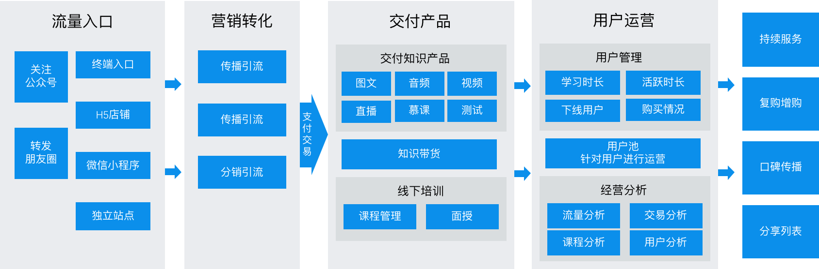 基于SaaS模式,提供给知识生产者一站式搭建知识店铺的服务,从营销传播、购买转化到学员管理,全方位覆盖整个经营过程,帮助知识生产者实现业务拓展。